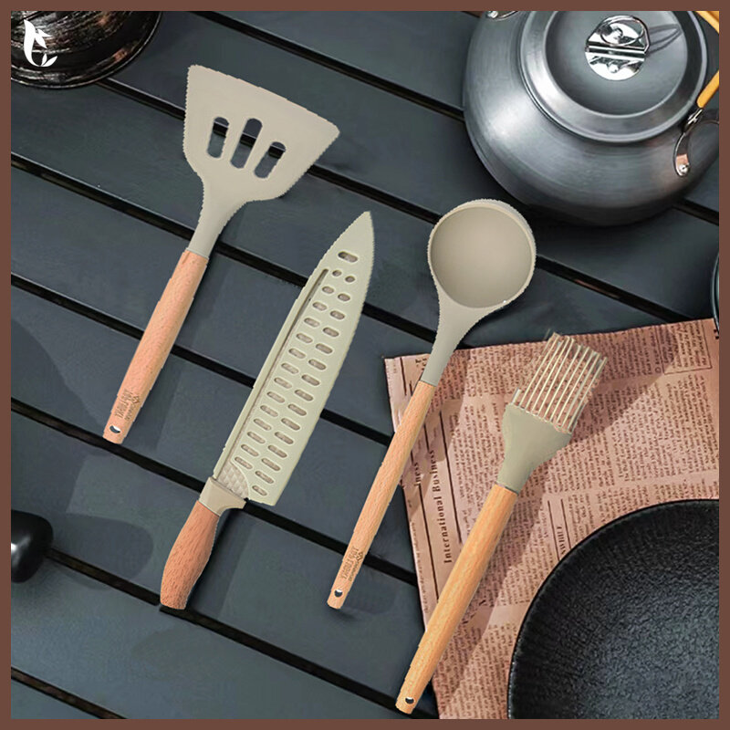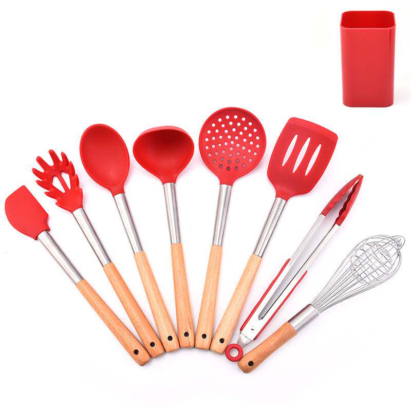 定制厂家硅胶厨具8件套烹饪工具木柄锅铲套装家用厨房用具DFR