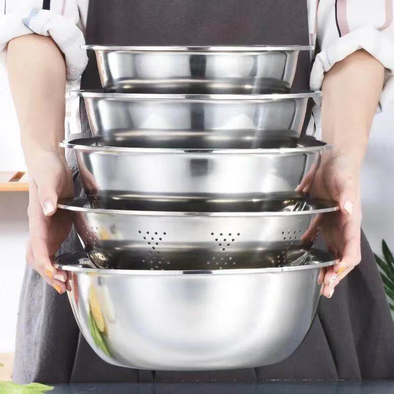 不锈钢锅具五件套盆加厚厨房打蛋洗菜和面漏汤盆淘米沥水烹饪用具