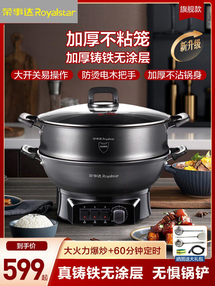 荣事达电炒锅家用多功能炒菜锅煎锅炒蒸煮一体式铸铁锅不粘笼电热