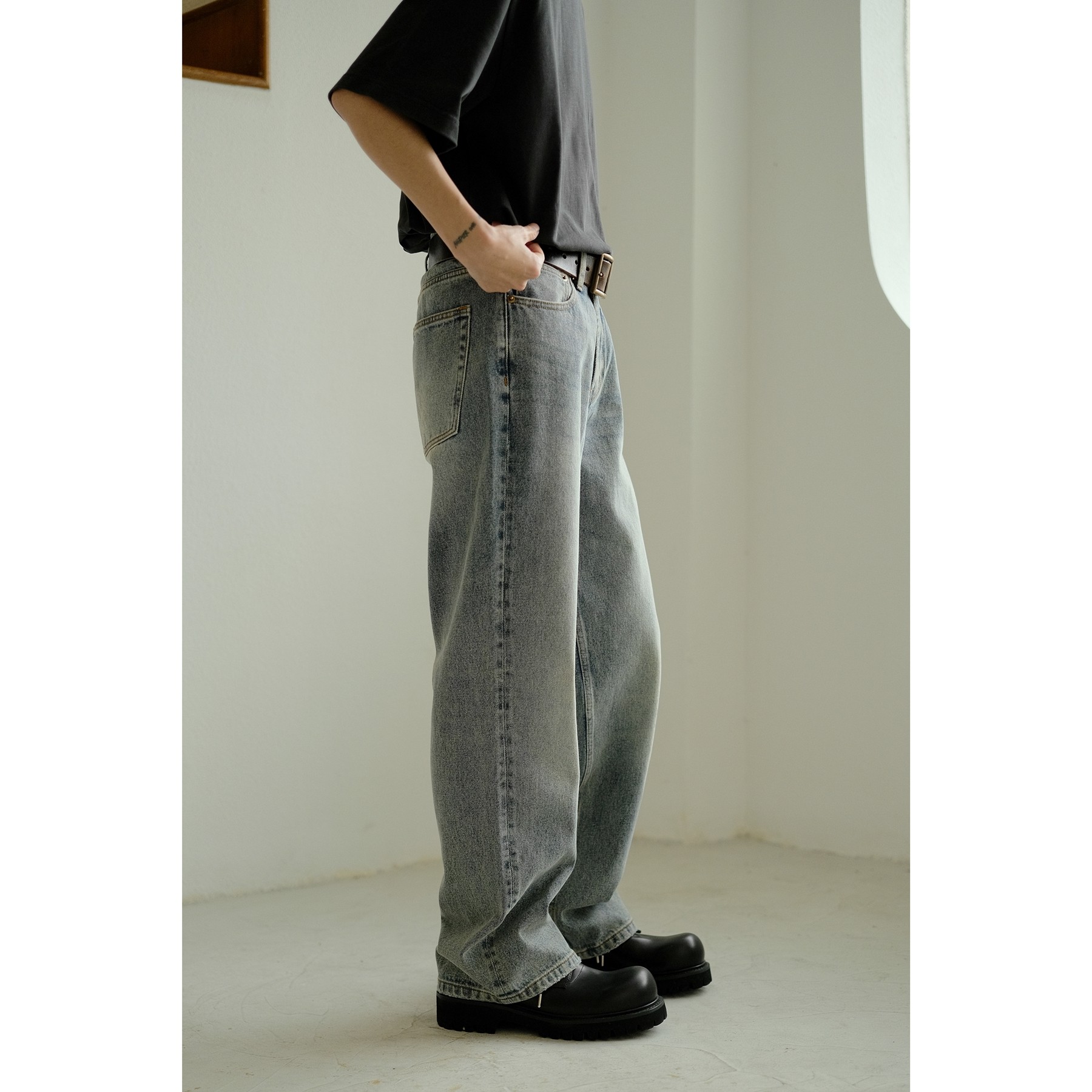 大牛传说高端赤耳丹宁复古阔腿牛仔裤子男直筒宽松大码春秋款潮牌