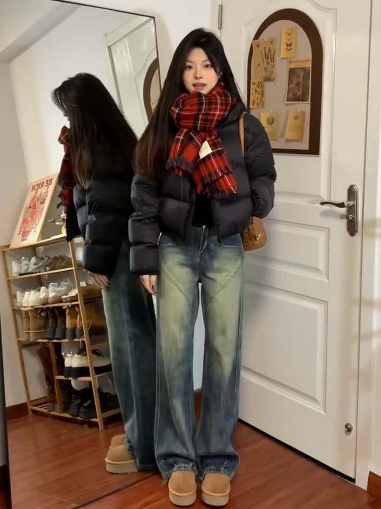 黑灰色直筒牛仔裤女高腰秋冬加绒大码胖mm宽松显瘦梨形身材阔腿裤