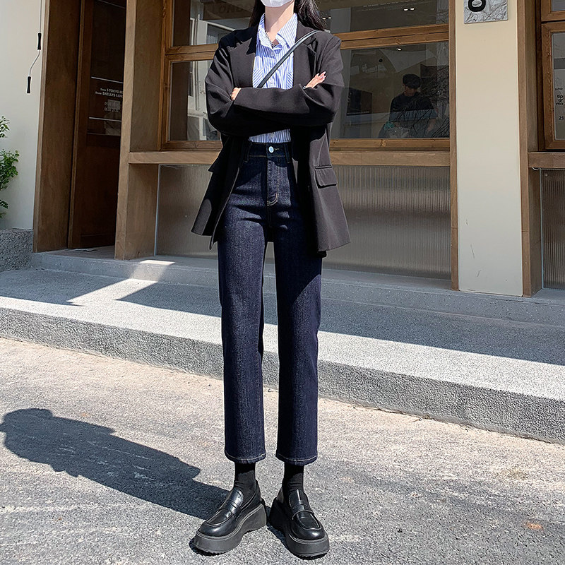 直筒牛仔裤女九分2023秋冬新款韩版蓝灰色显瘦小个子加绒烟管裤子