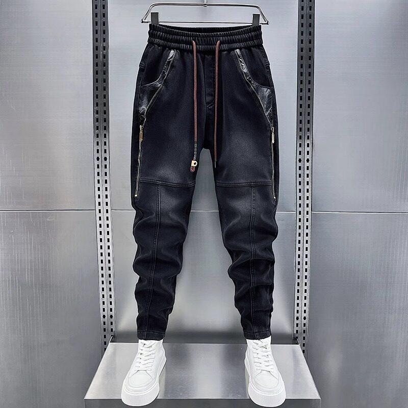 春秋新款工装牛仔裤男士潮牌痞帅宽松百搭束脚抽绳哈伦裤休闲长裤