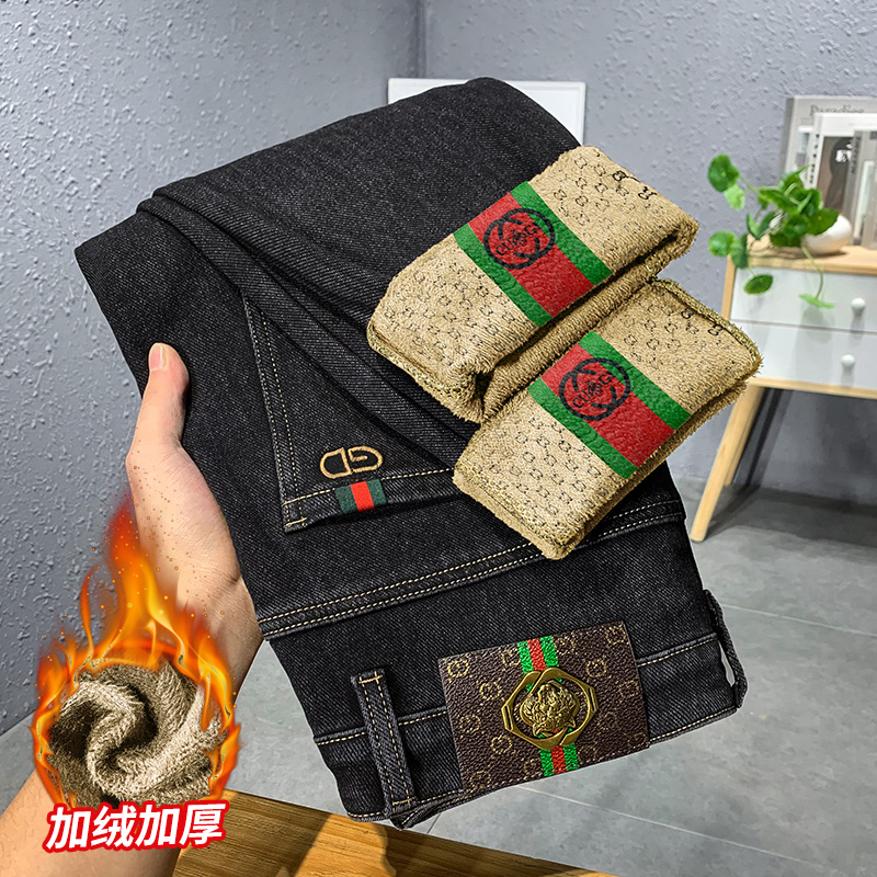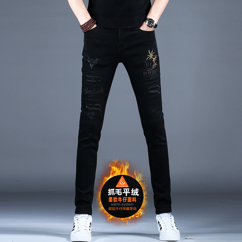 欧洲站高端潮牌印花牛仔裤男秋冬加绒保暖轻奢弹力休闲修身小脚裤