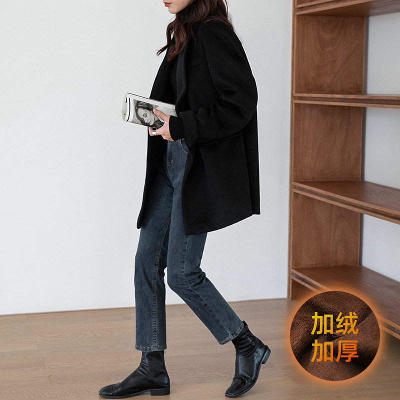 加绒黑色烟管牛仔裤女2023年秋冬新款显瘦小个子直筒窄版九分裤子