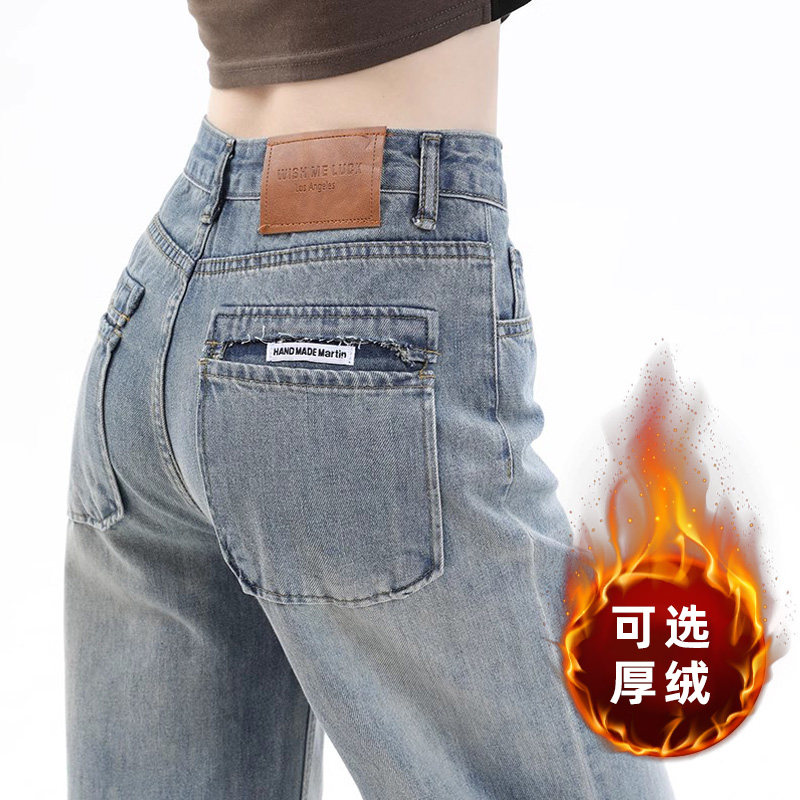 复古高腰做旧直筒牛仔裤女2023新款秋冬薄绒显瘦宽松阔腿裤拖地子