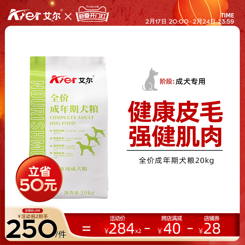 艾尔全价成年期犬粮20kg中大型通用市场犬主粮40斤金毛萨摩耶狗粮