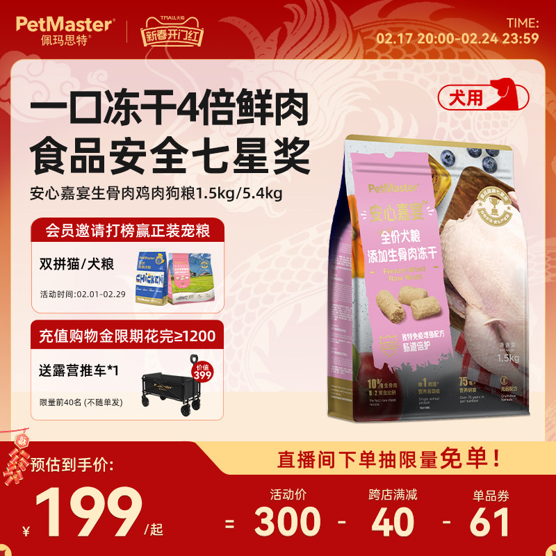 petmaster佩玛思特安心嘉宴生骨肉冻干鸡牛肉主粮全价犬粮1.5kg