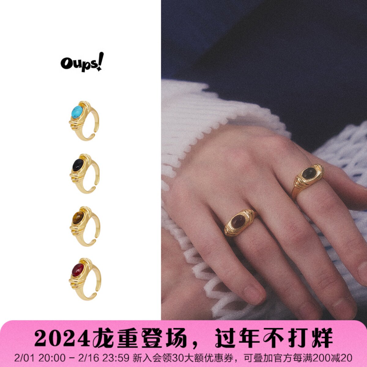Dare买手店 oups!时序之歌戒指金色复古欧美蓝松石虎眼石黑玛瑙