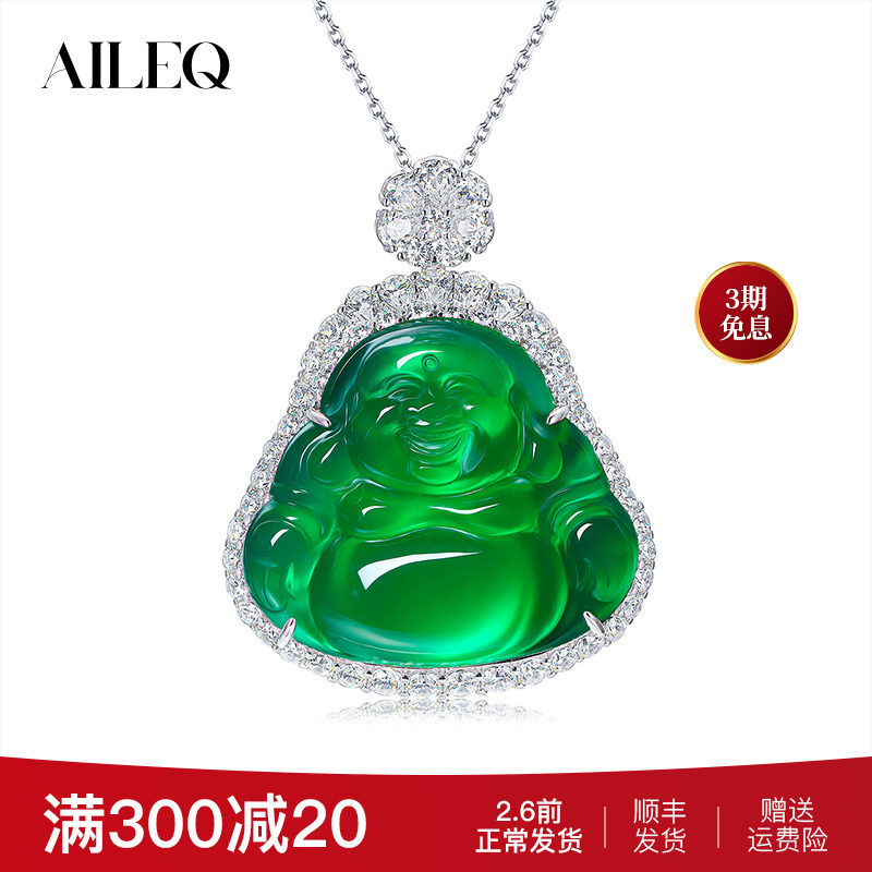 AILEQ大佛公纯银玉髓玛瑙弥勒佛媲美翡翠帝王绿女玉石吊坠项链k30