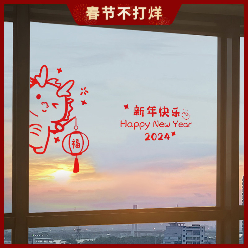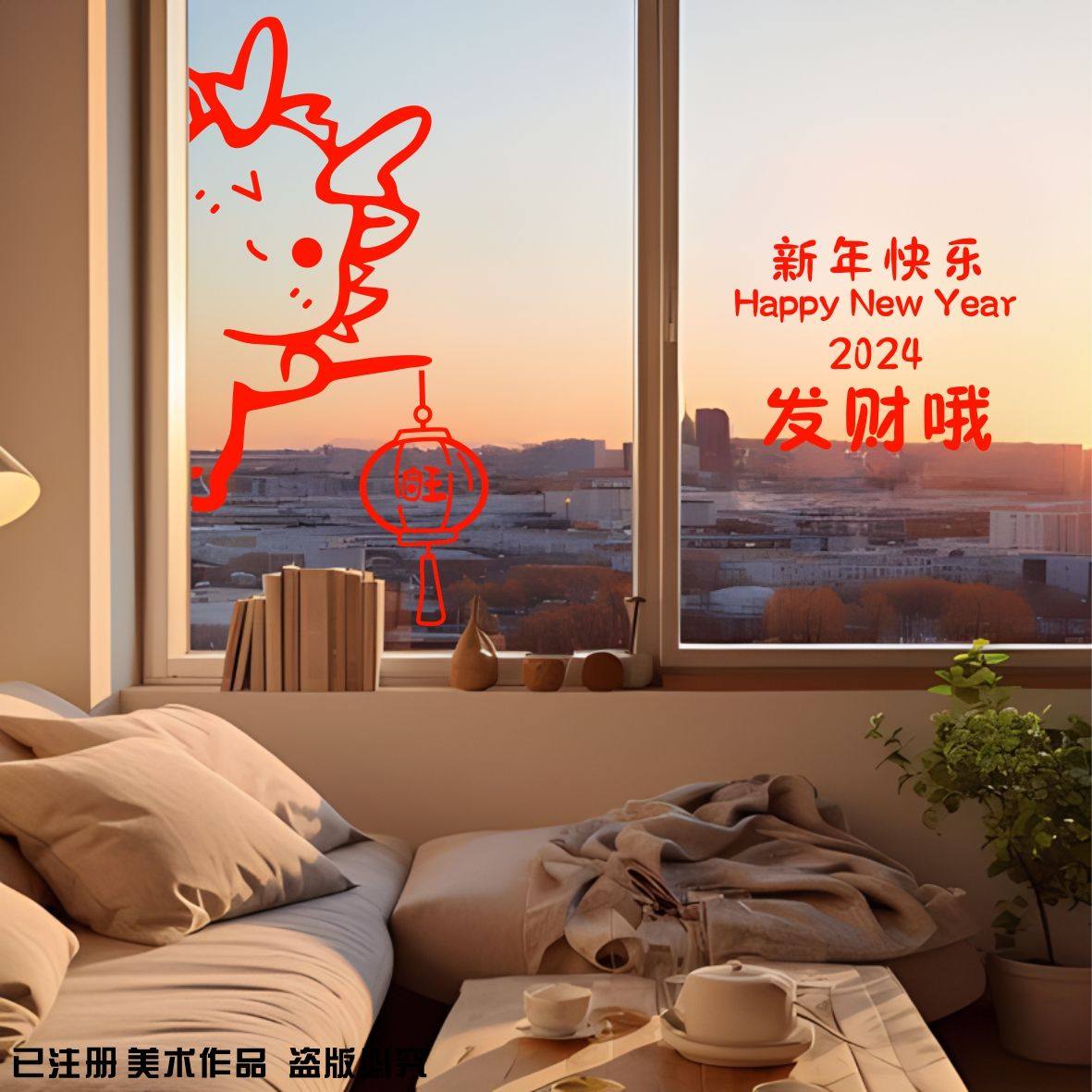 新年2024龙年过年装饰布置春节静电玻璃窗户窗花门贴纸贴画年画