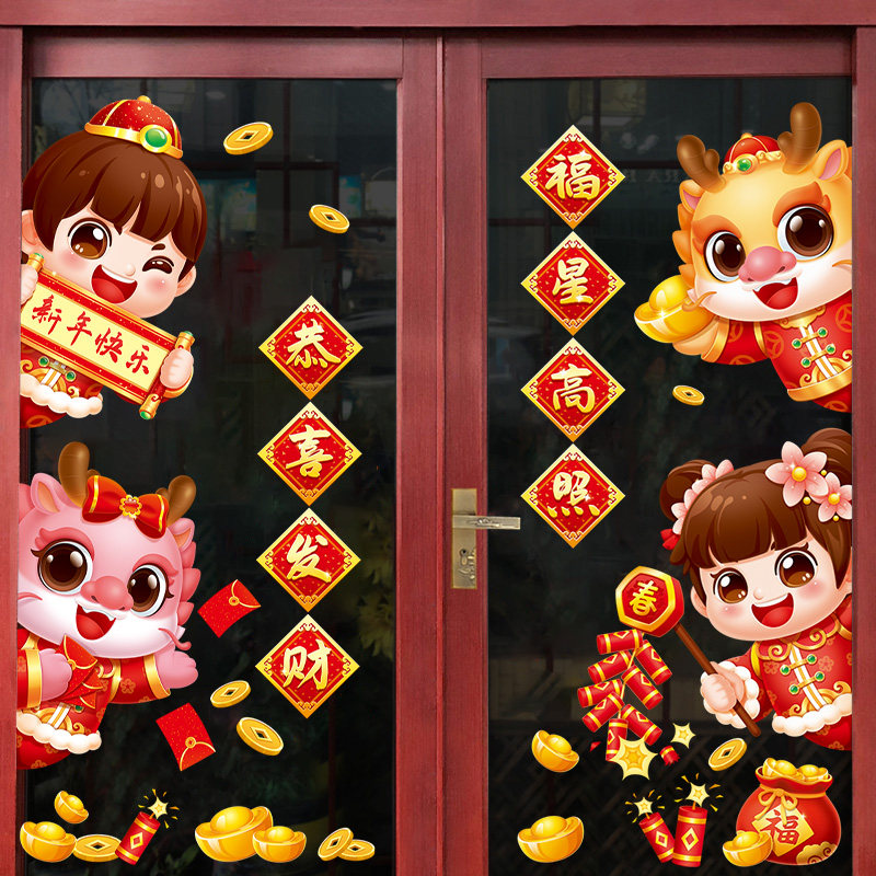 2024新年装饰玻璃门贴纸窗贴橱窗布置春节对联年画龙年静电窗花贴