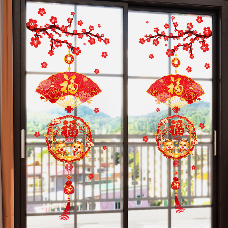 2024新年装饰玻璃贴纸龙年门贴窗花新款福字年画中国风墙贴画过年