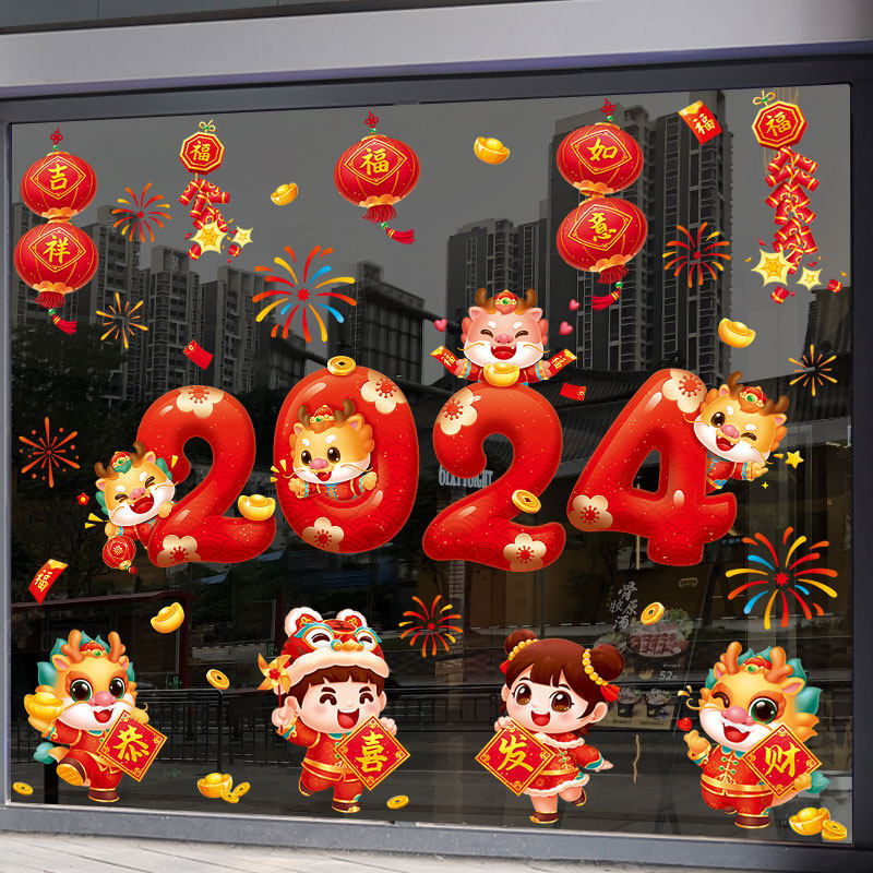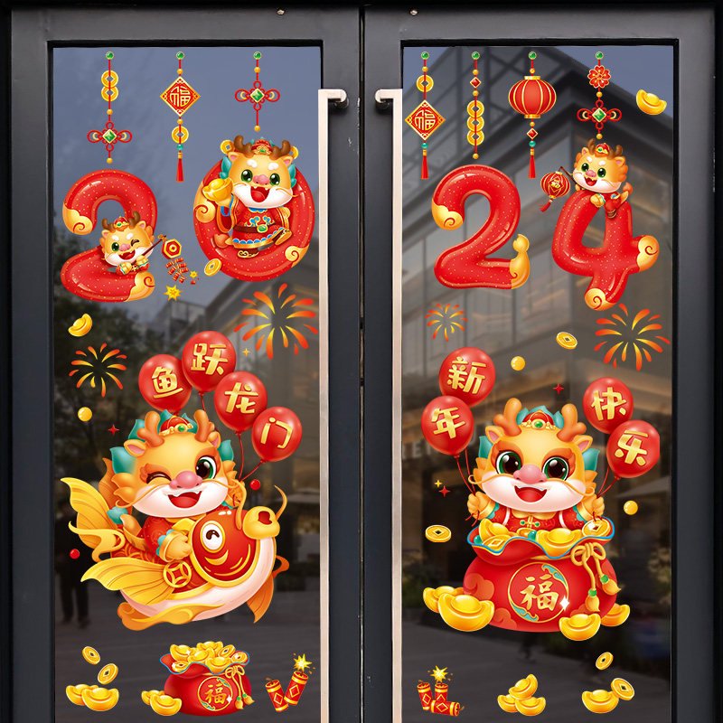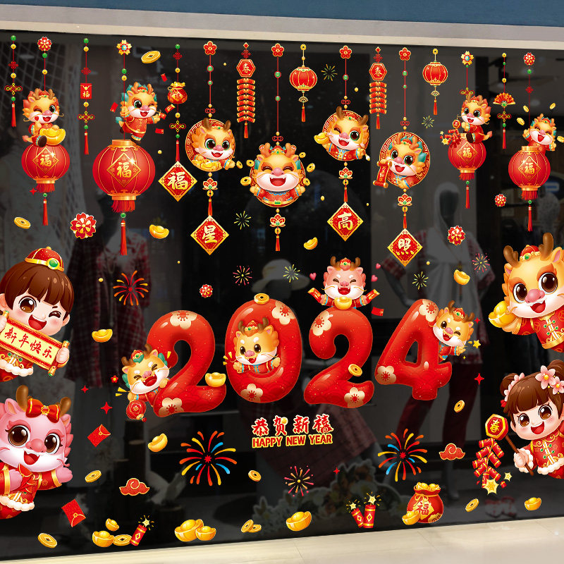 2024新年元旦贴画春节过年装饰龙年布置玻璃贴纸门贴橱窗窗花贴