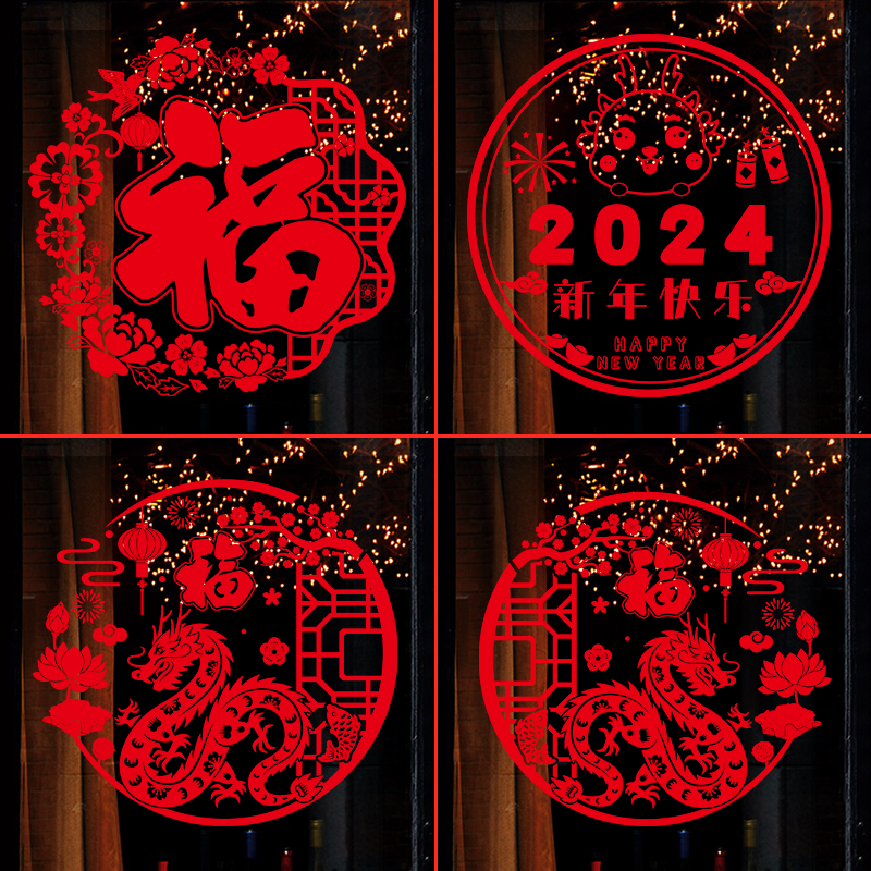 2024新年窗花龙年贴纸春节过年装饰布置橱窗玻璃静电窗贴门贴新款