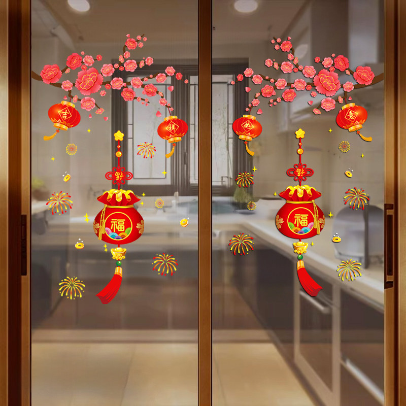 2024新年窗花贴纸 龙年福字灯笼春节商城店铺橱窗玻璃门装饰贴画