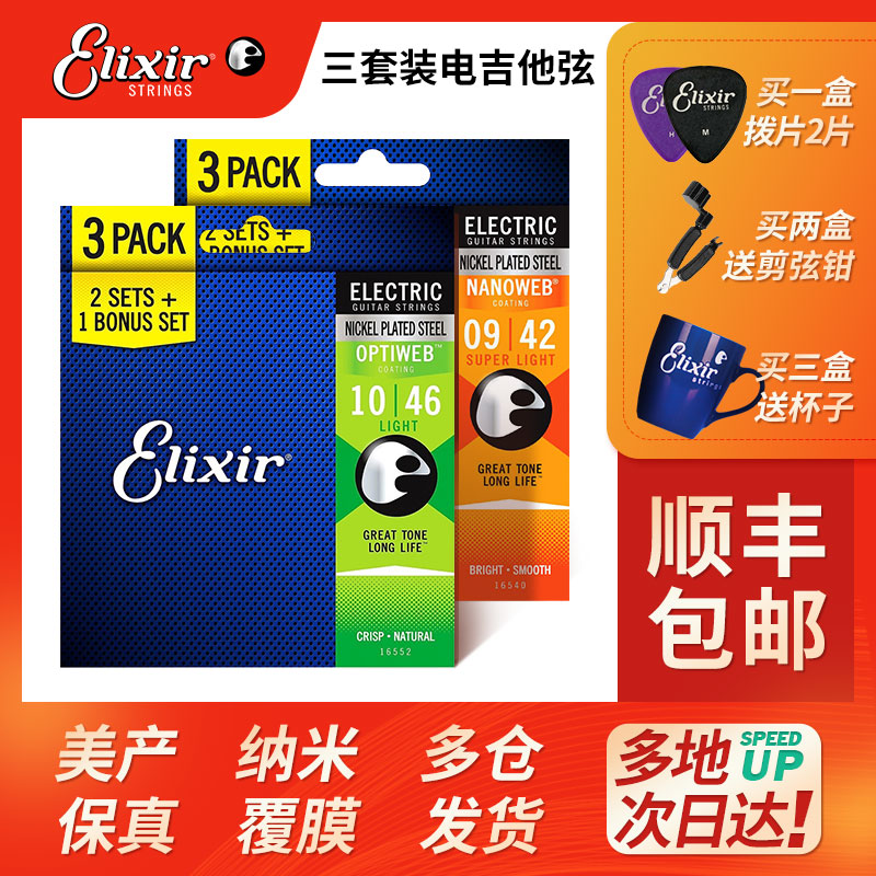 Elixir 电吉他弦伊利克斯三套装 NANOWEB镀膜吉他琴弦3套装09 010