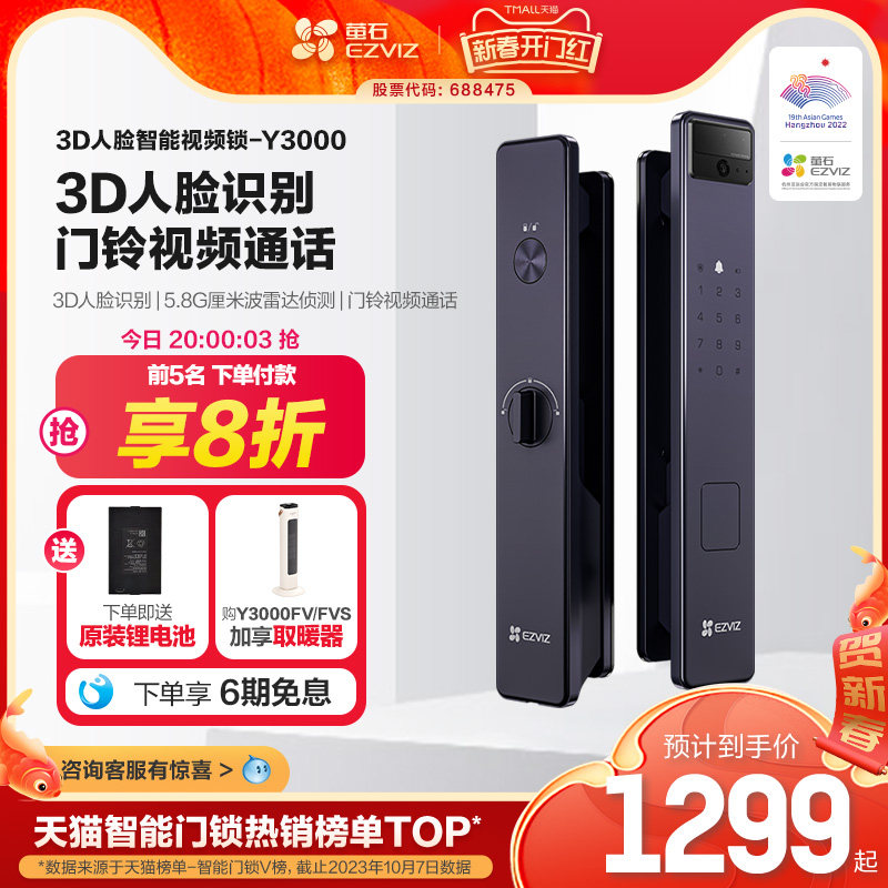 萤石人脸识别智能猫眼视频锁y3000无需指纹家用防盗门电子密码锁