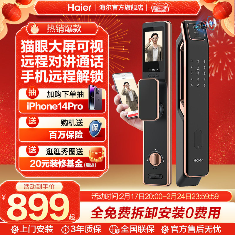 海尔指纹锁智能门锁智能锁16猫眼可视电子锁密码锁家用门锁旗舰店