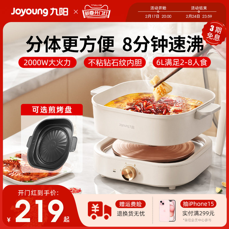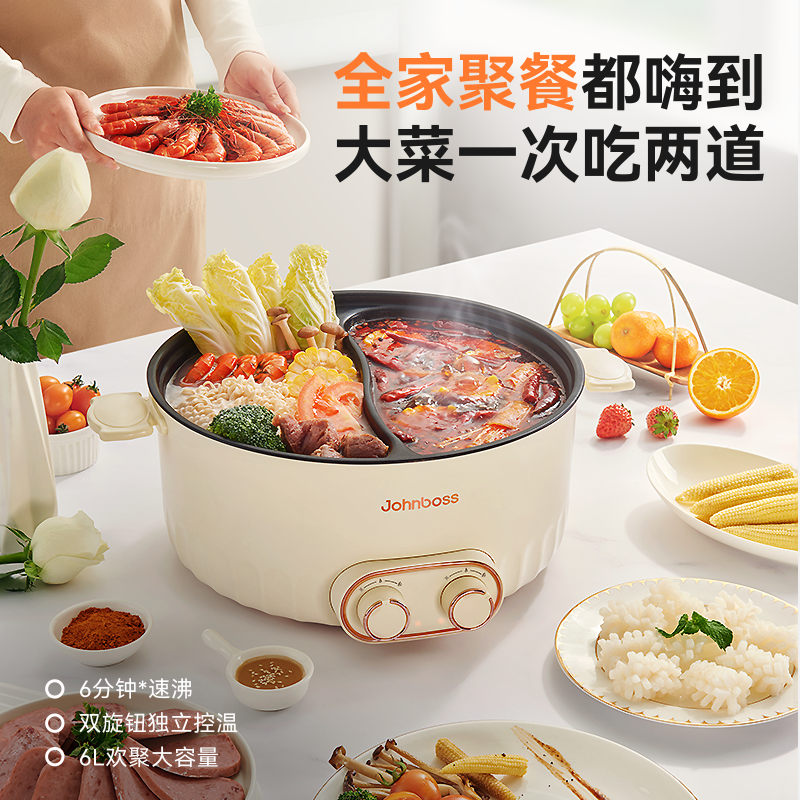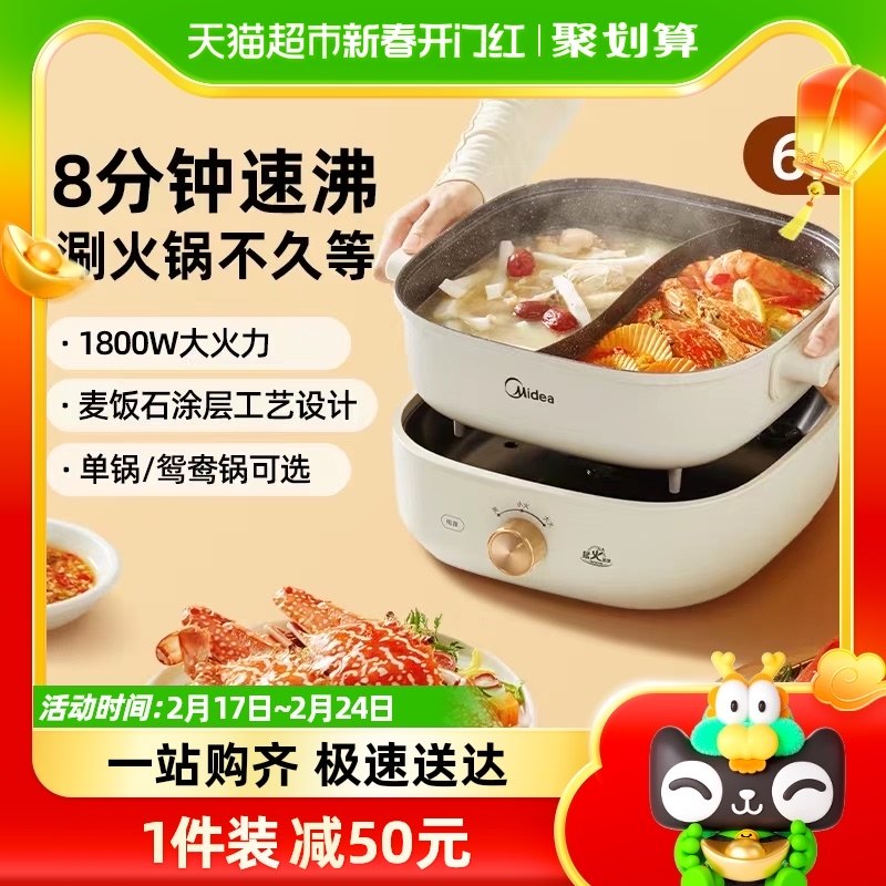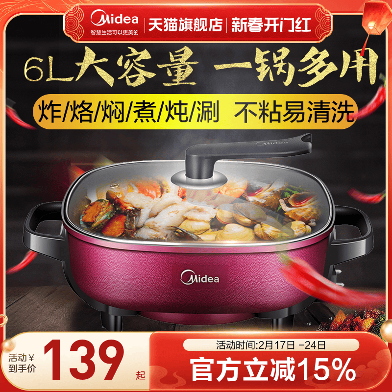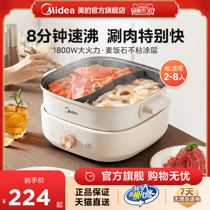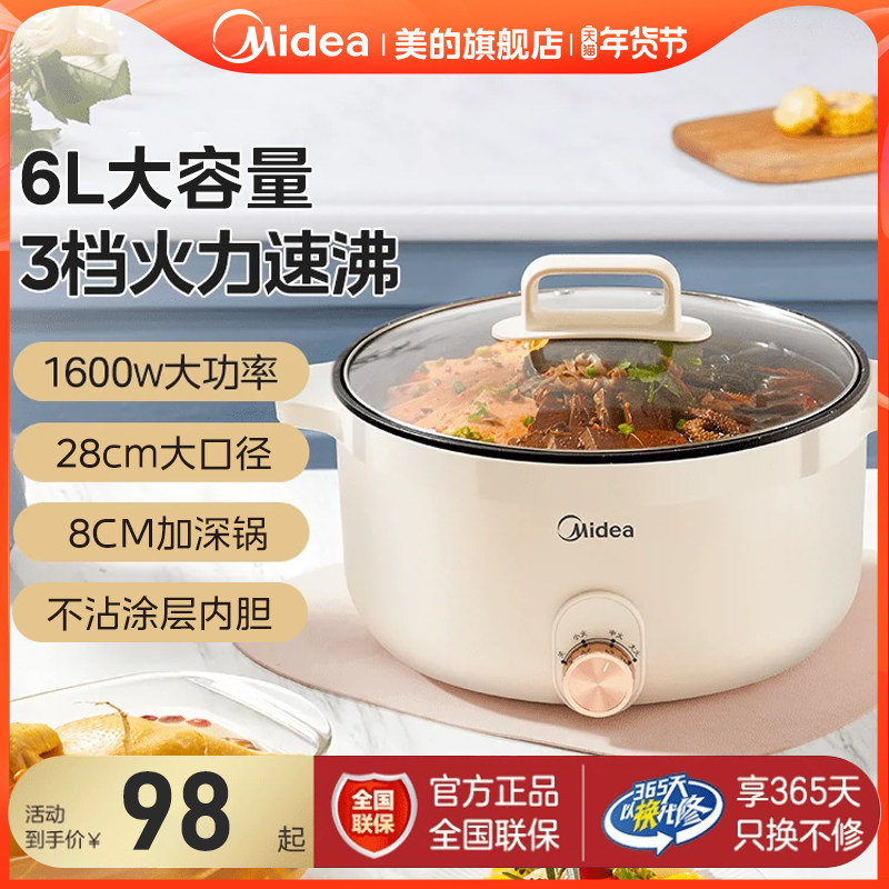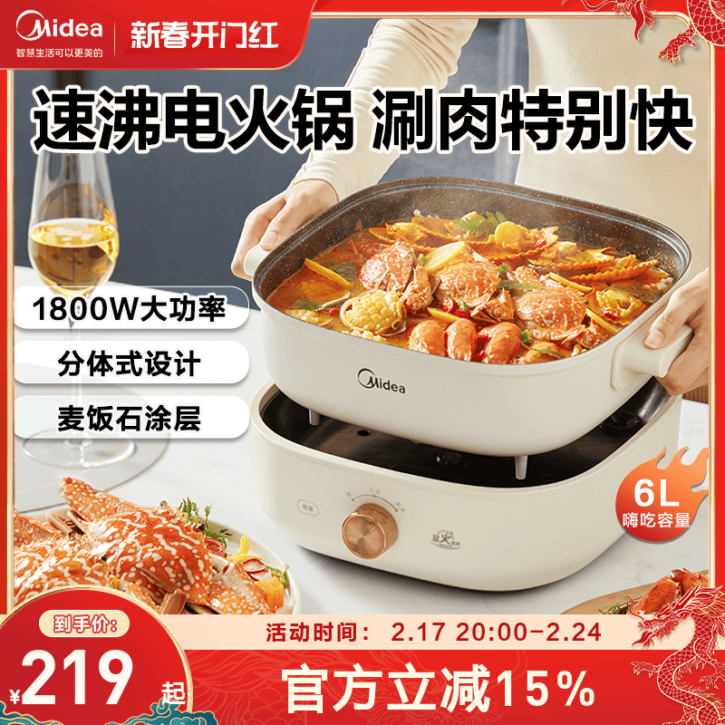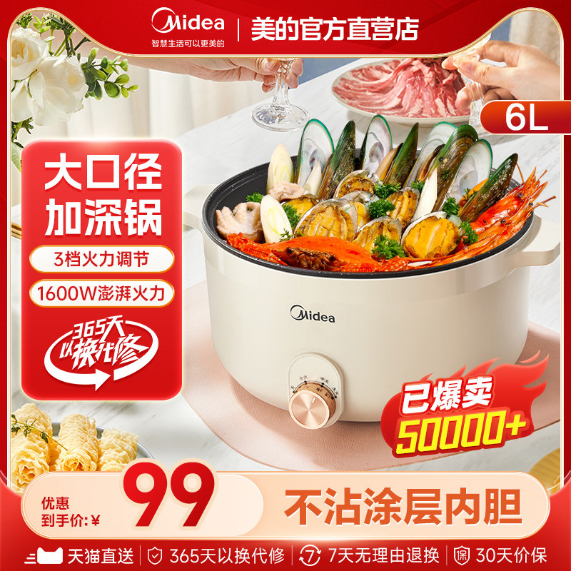 美的电火锅6L大容量多功能分体式家用电热电煮锅不粘锅8分钟速沸