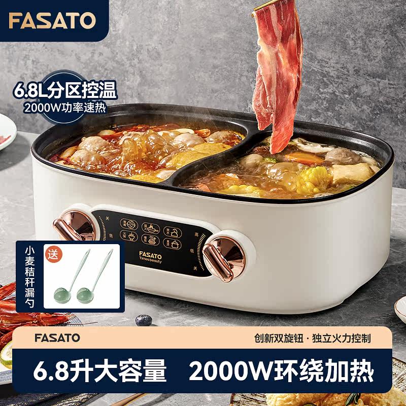 FASATO鸳鸯火锅6.8L家用大容量多功能电煮锅分体式炒菜不粘电炒锅