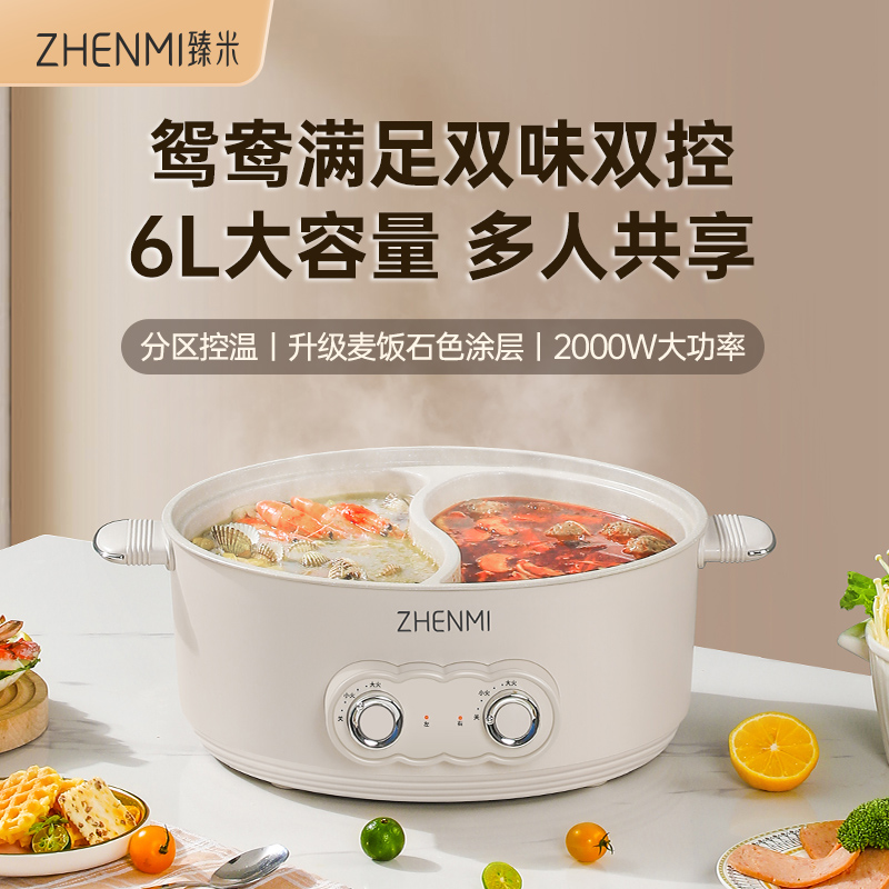 臻米鸳鸯电火锅锅家用多功能大容量一体式不粘电煮锅火锅专用锅6L