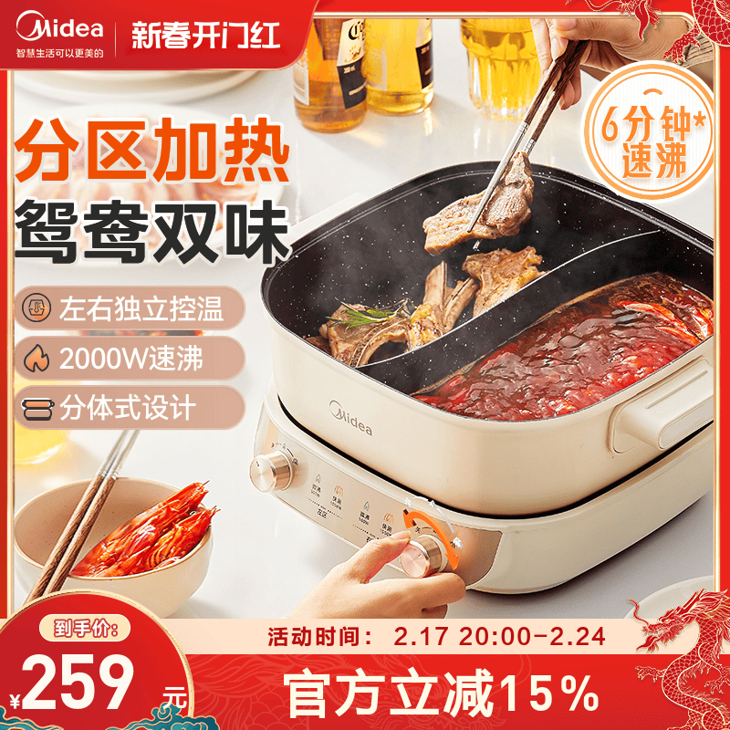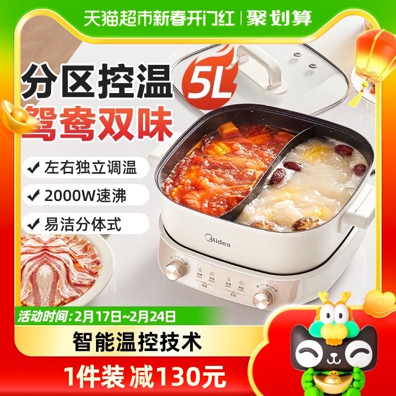 美的电火锅家用多功能煎炒分控速沸电热锅不粘分体式电煮锅鸳鸯锅