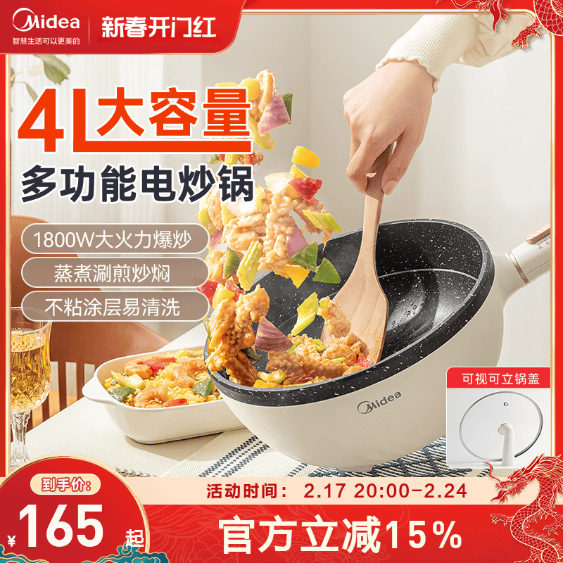 【热销】美的电炒锅家用煮锅多功能炒菜火锅宿舍蒸锅煮煎炒一体锅