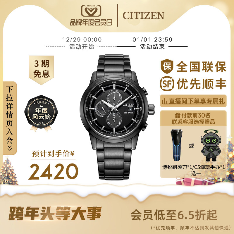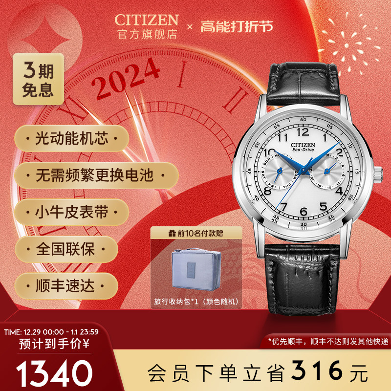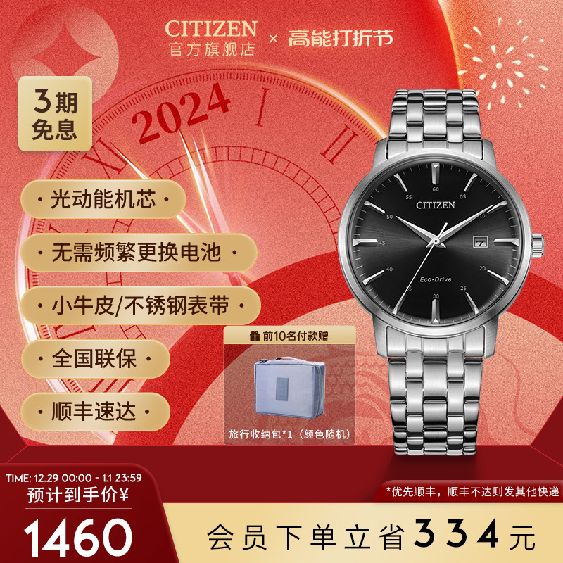西铁城旗舰店光动能石英防水商务休闲钢带学生礼物男士手表BM7460