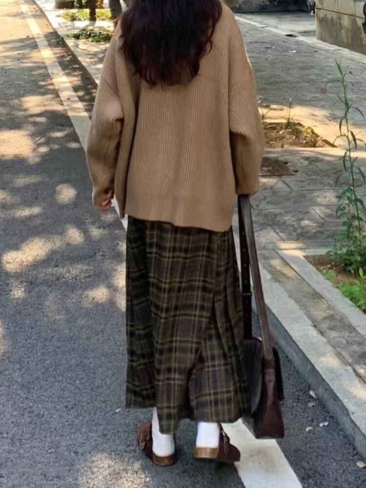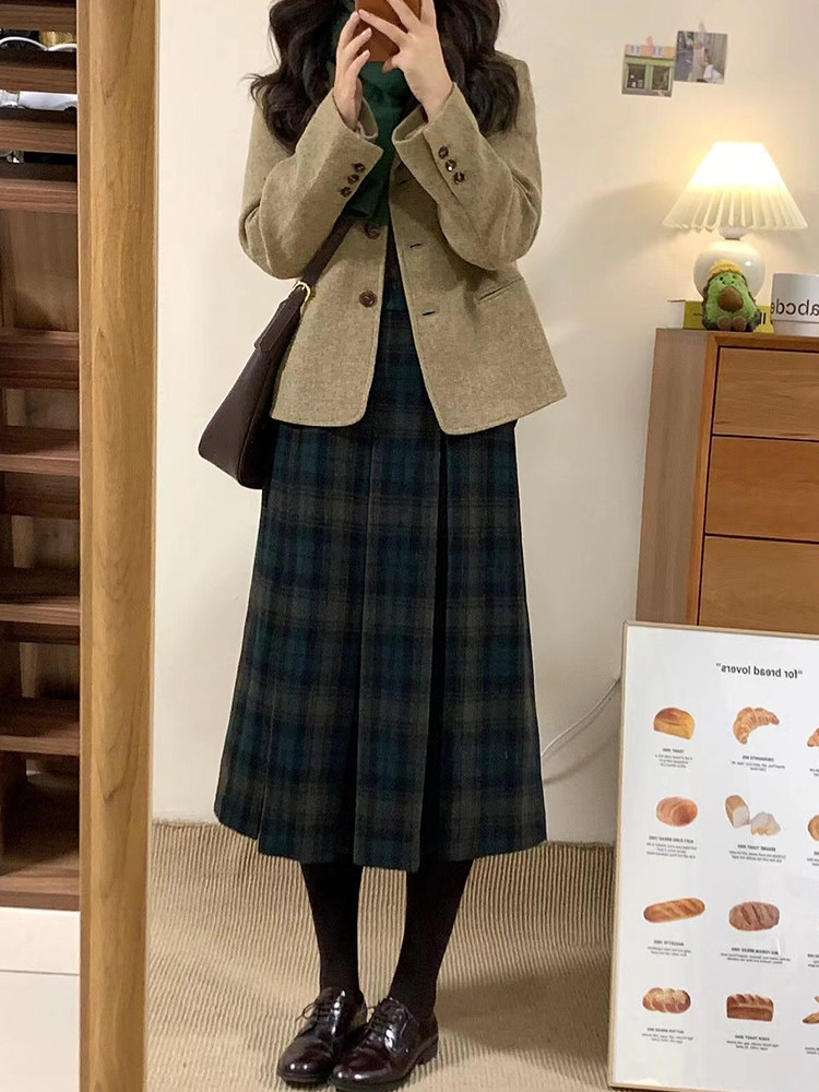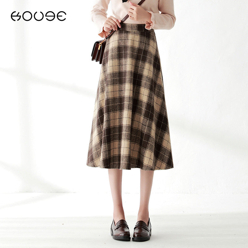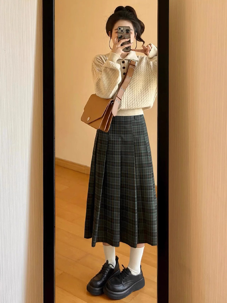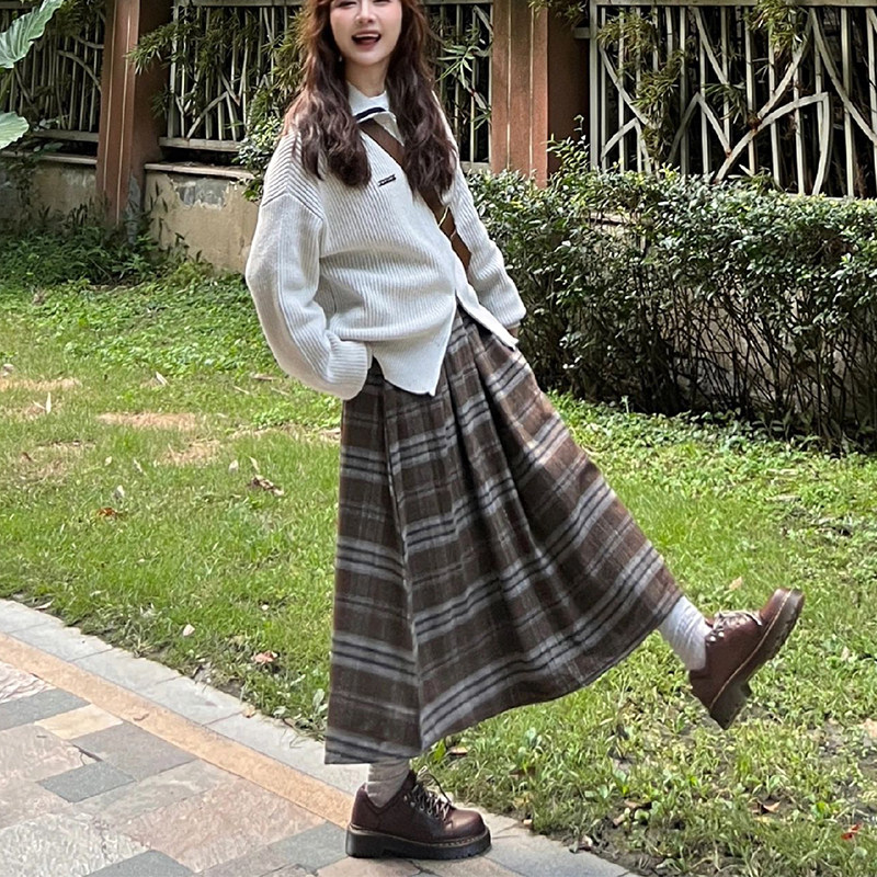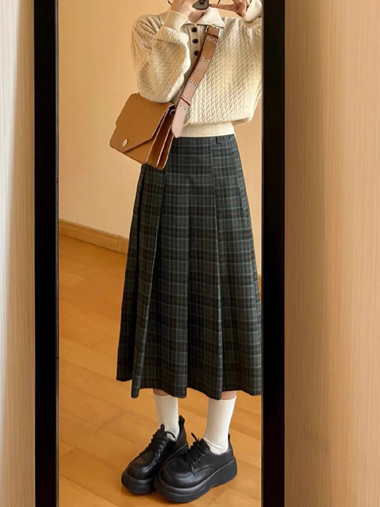 复古格子半身裙秋冬大码梨形身材穿搭遮肚子显瘦中长款a字百褶裙