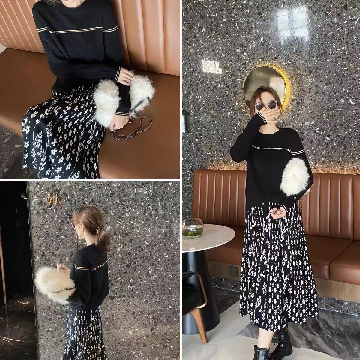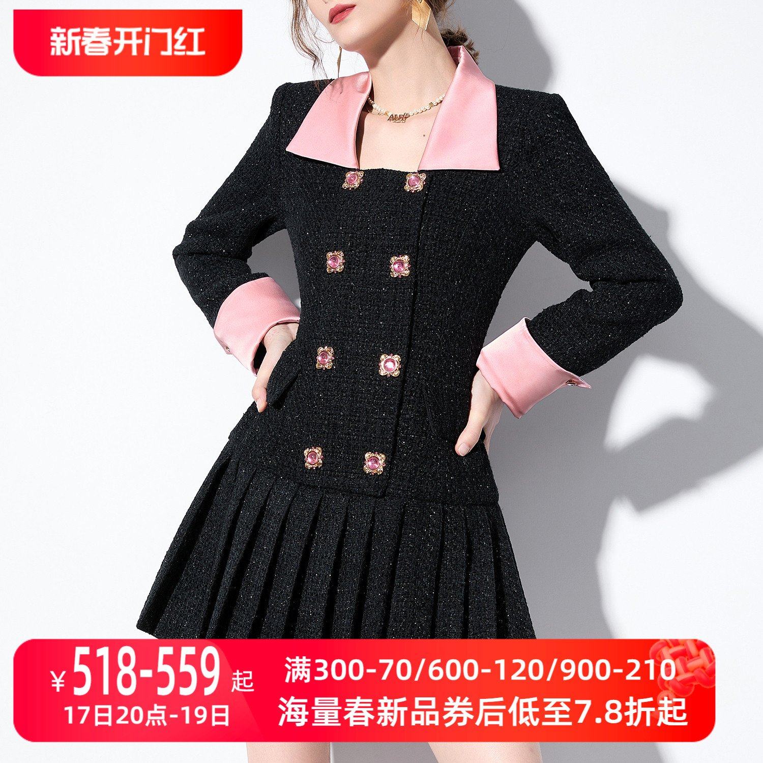 AUI黑色御姐气质小香风连衣裙女2023秋新款高级感职业修身百褶裙