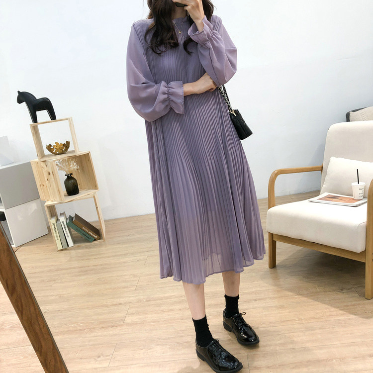 line商场同款百褶连衣裙女纯色长袖休闲轻熟风长裙AWOPLC0200