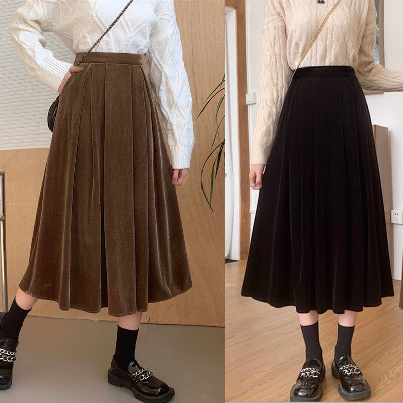 百褶裙半身裙女秋冬大码丝绒中长款a字松紧高腰显瘦褶皱大摆伞裙