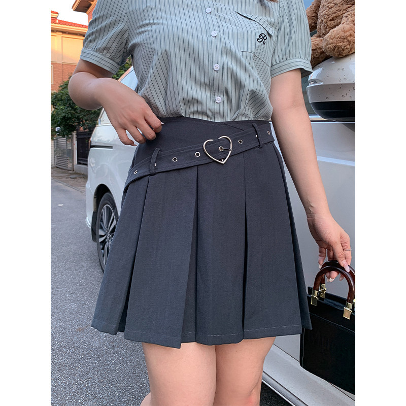 大码胖妹妹甜酷辣妹灰色高腰百褶裙女夏双腰带a字半身裙显瘦短裙