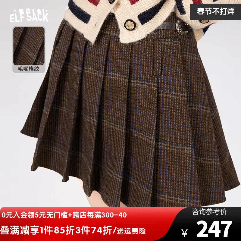 妖精的口袋美拉德百褶半身裙女2023冬季新款高腰显瘦a字格纹半裙