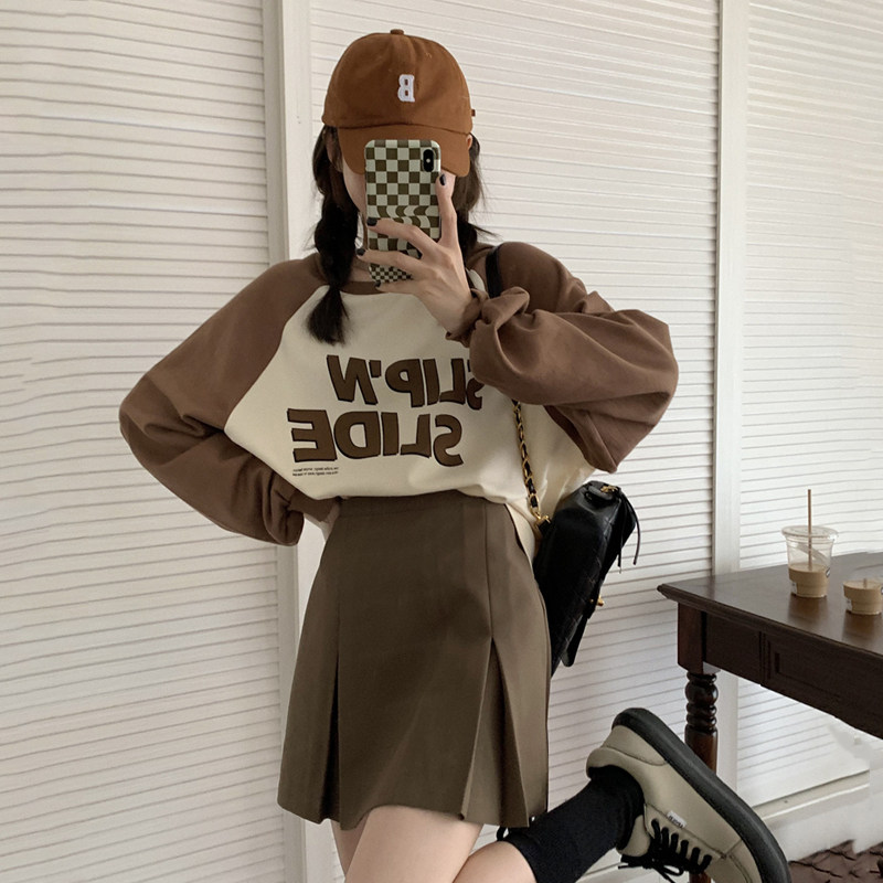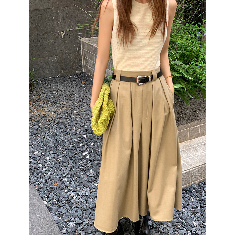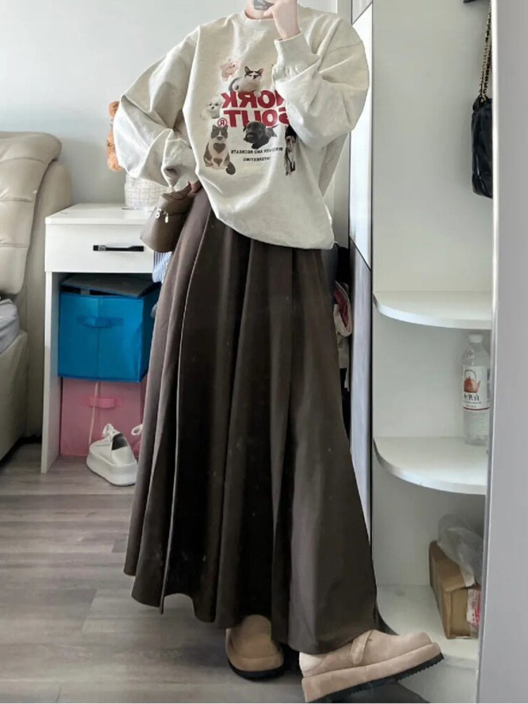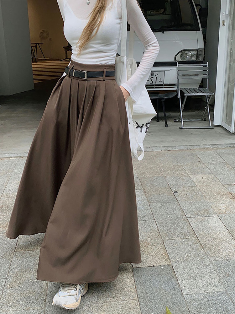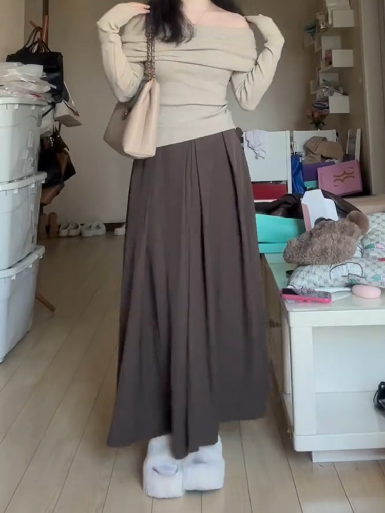 美拉德穿搭高腰棕色a字半身裙女大码胖mm遮肚藏肉百褶显瘦长裙春
