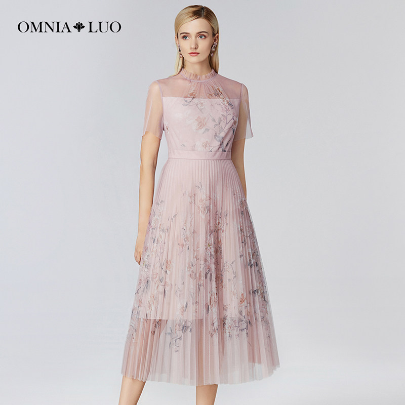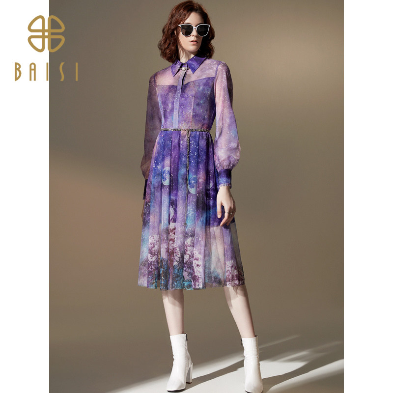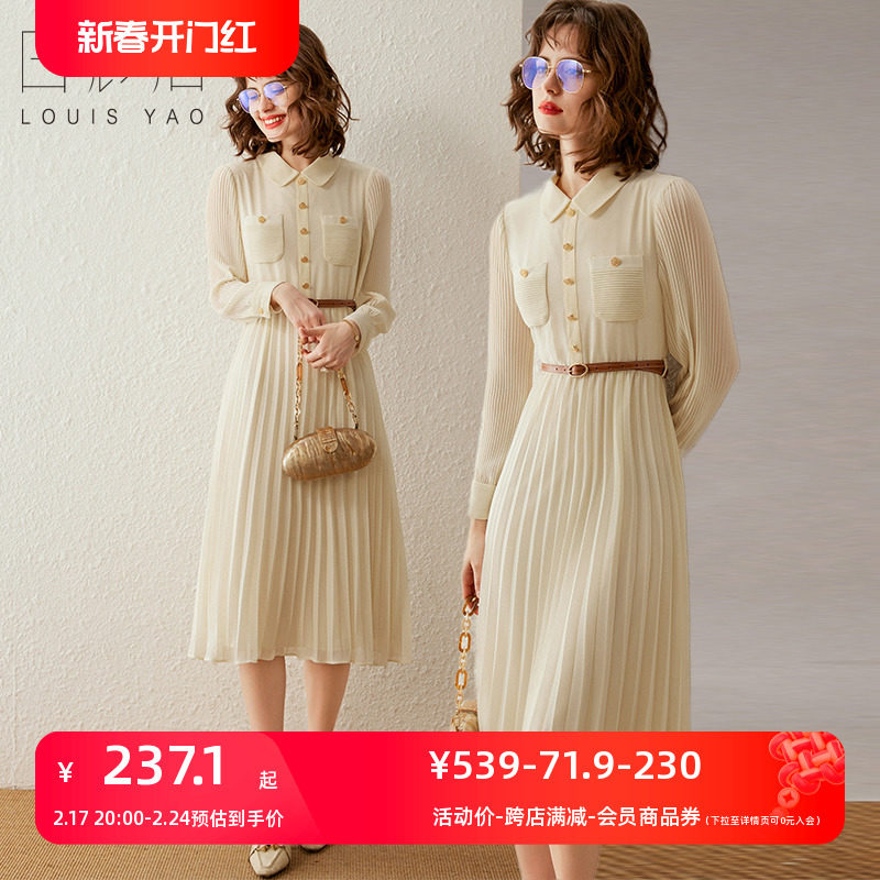 翻领长款百褶2022百丝商场同款秋季新品网纱长袖伞型连衣裙女