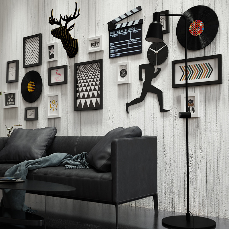 现代简约客厅鹿头照片墙创意大钟表组合相框黑白艺术装饰挂画框