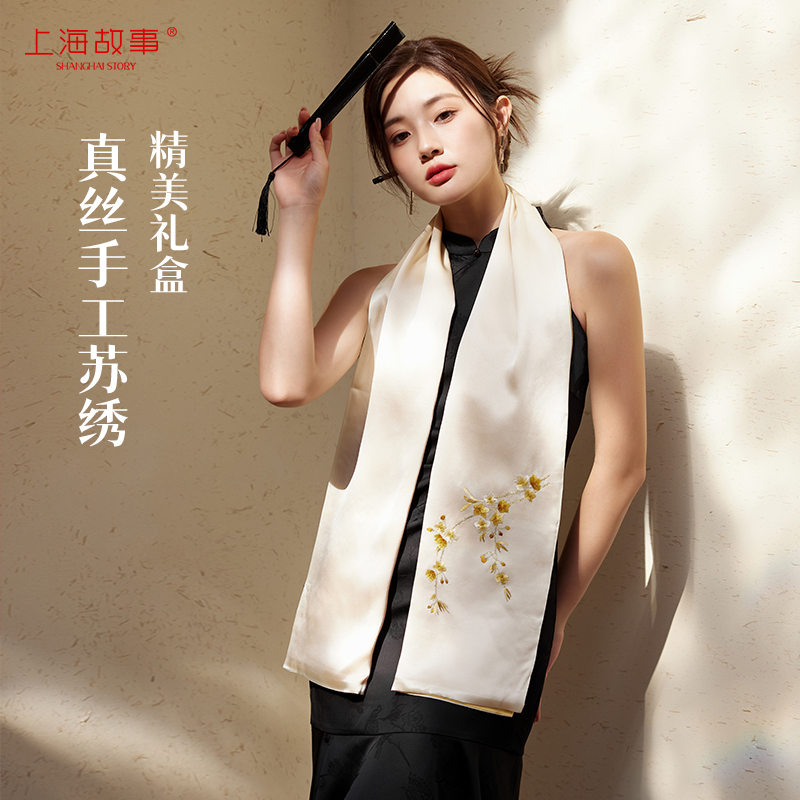 上海故事秋季真丝丝巾女妈妈礼盒苏绣丝绸桑蚕丝披肩手工刺绣围巾