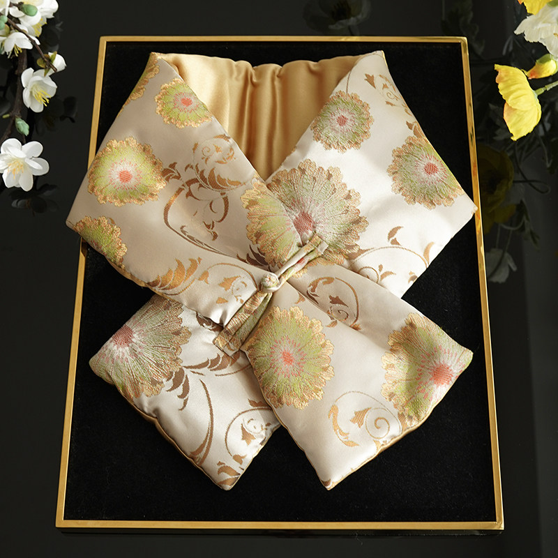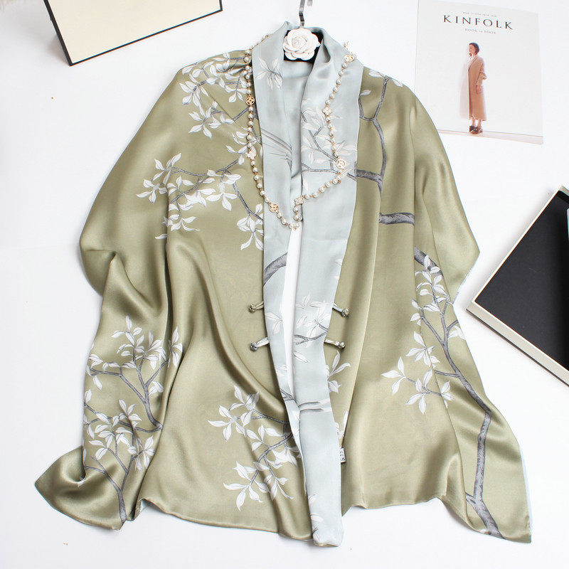 「玉兰花」盘扣缎面真丝围巾女秋冬百搭长款桑蚕丝双层面披肩两用