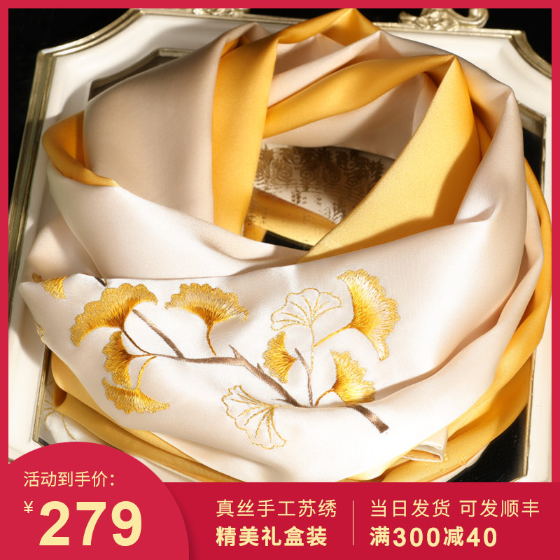 丝巾女真丝桑蚕丝春秋苏绣银杏披肩高端披肩苏州送礼妈妈国风围巾
