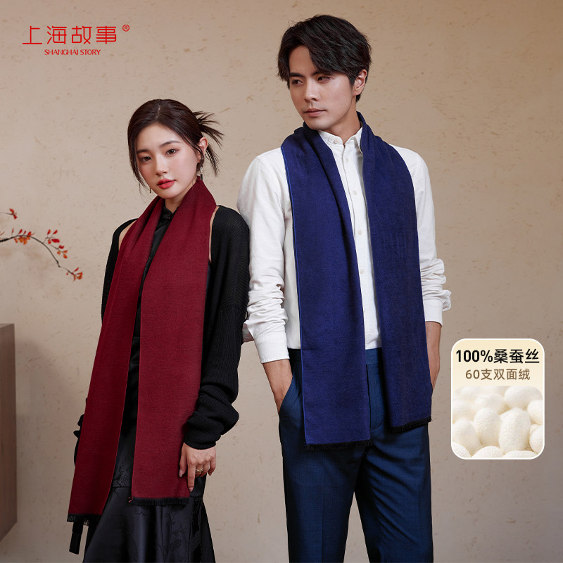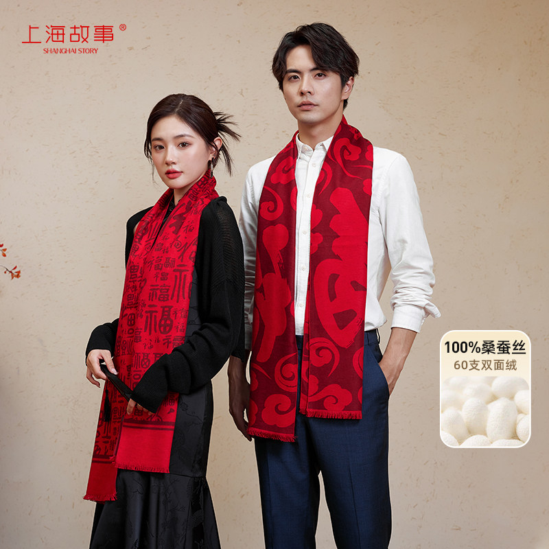 上海故事2023秋冬新款围巾女桑蚕丝真丝拉绒围脖情侣款中国红披肩