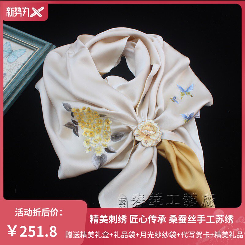 苏绣成品新款手工苏绣真丝春秋桑蚕丝围巾苏州丝绸丝巾扣礼盒套装