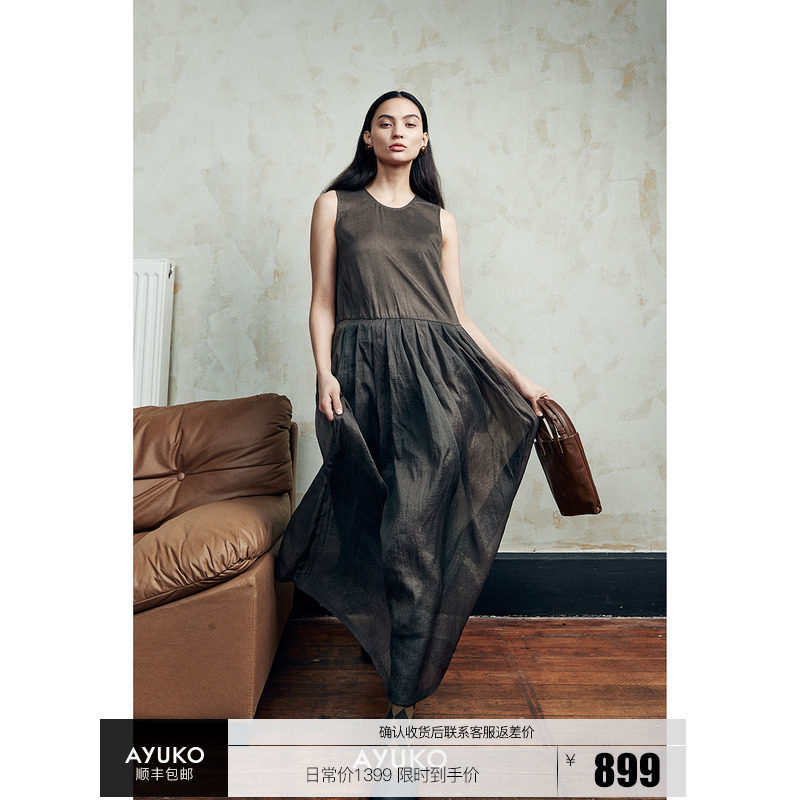 醋酸真丝连衣裙女夏季新款法式扎染褶皱肌理感v领通勤吊带长裙子