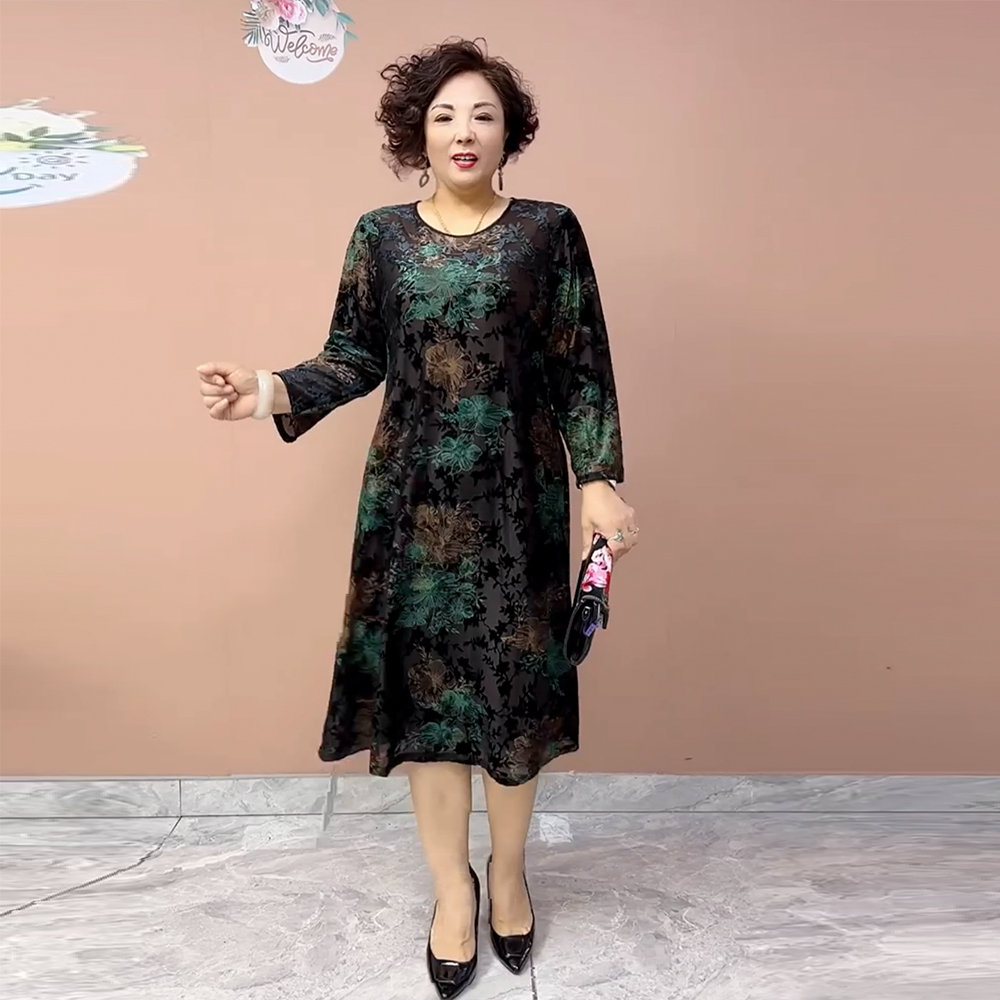 秋季新款气质妈妈装宽松遮肉真丝植绒烧花圆领大码洋气长款连衣裙
