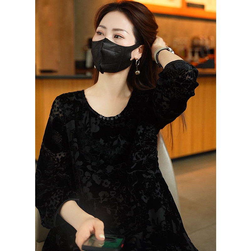 黑色时尚中年妈妈气质桑蚕丝裙子2023年春季新款真丝丝绒连衣裙女