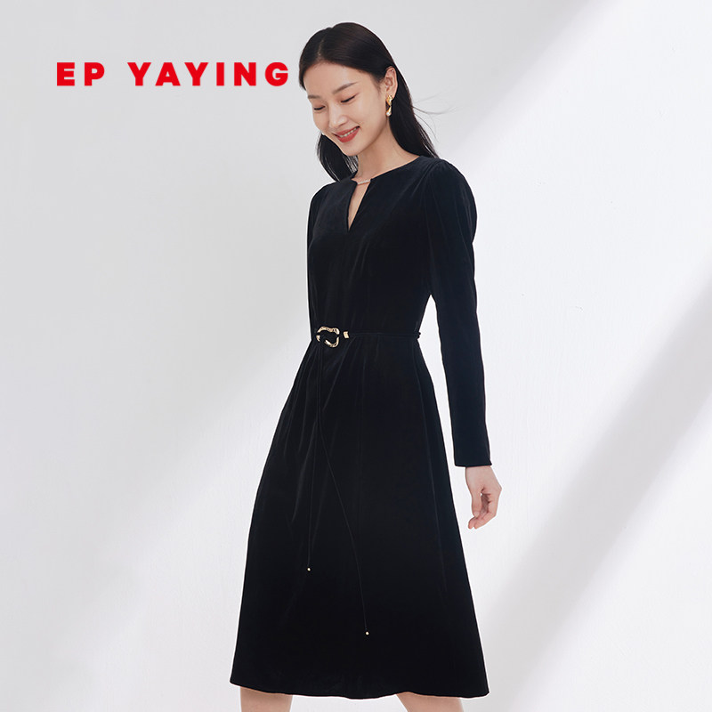 EP雅莹国风 真丝弹力丝绒小黑裙礼服连衣裙 2024春夏新品4616A