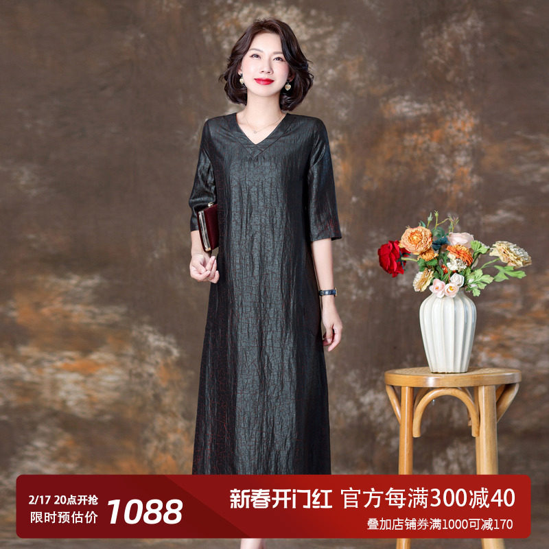 夏季中老年妈妈气质短袖真丝V领旗袍连衣裙桑蚕丝宽松大码长裙子