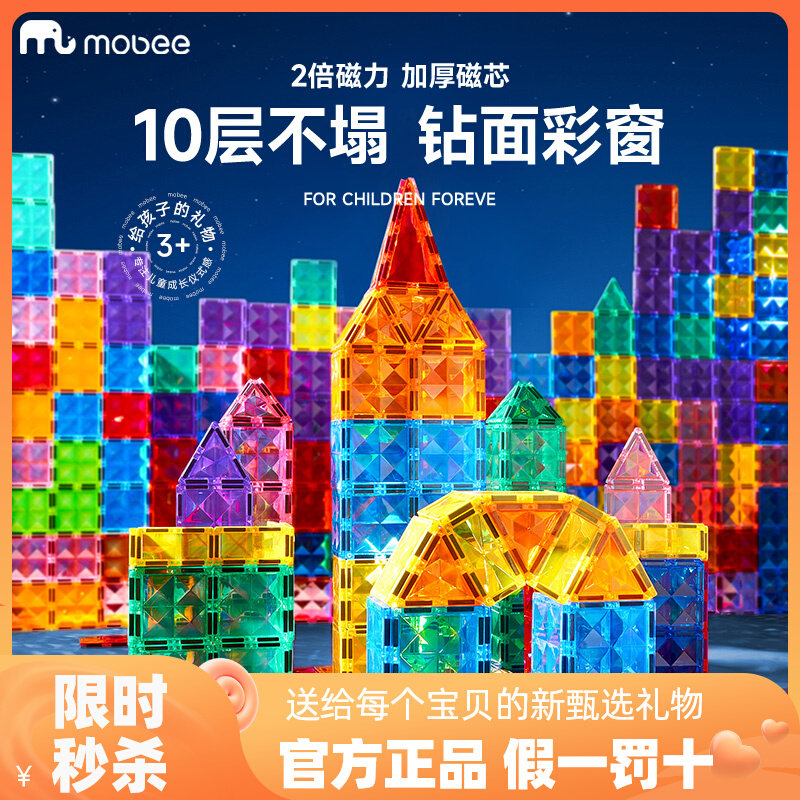 mobee磁力片儿童益智玩具贴片彩窗积木拼装男女孩拼图超强磁铁棒
