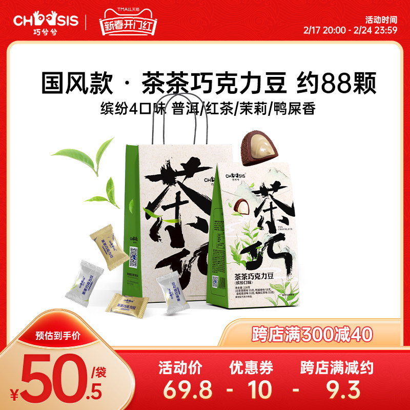 巧兮兮茶茶巧克力豆220g黑巧国风年货礼物生日糖果纯可可茶味零食